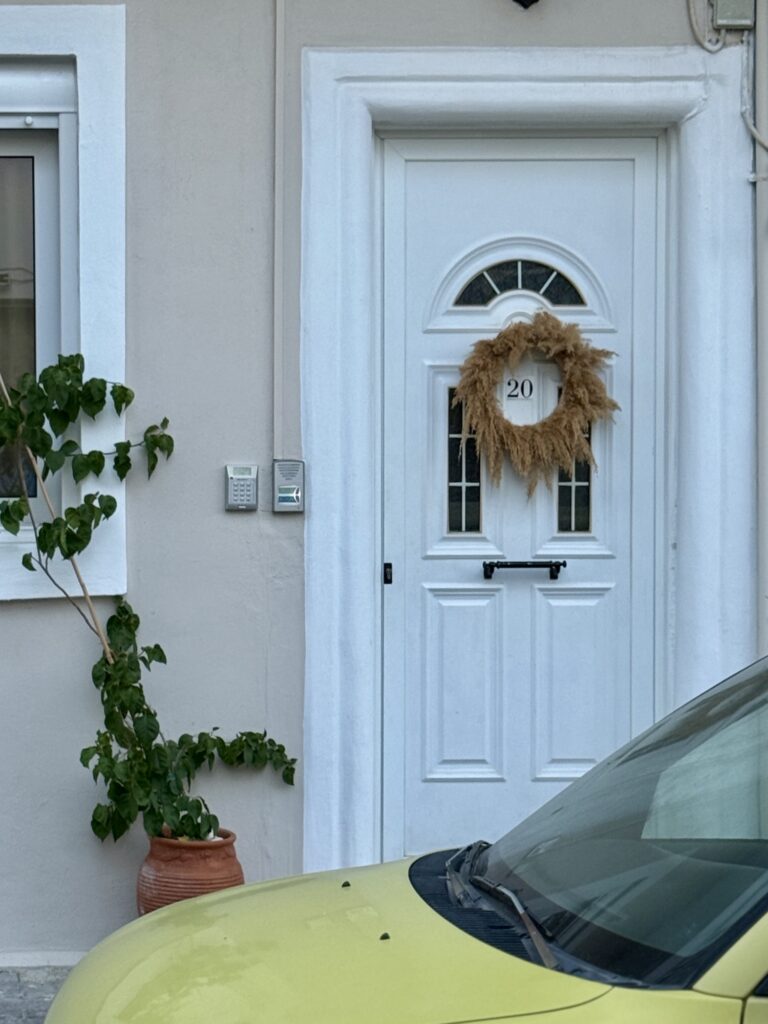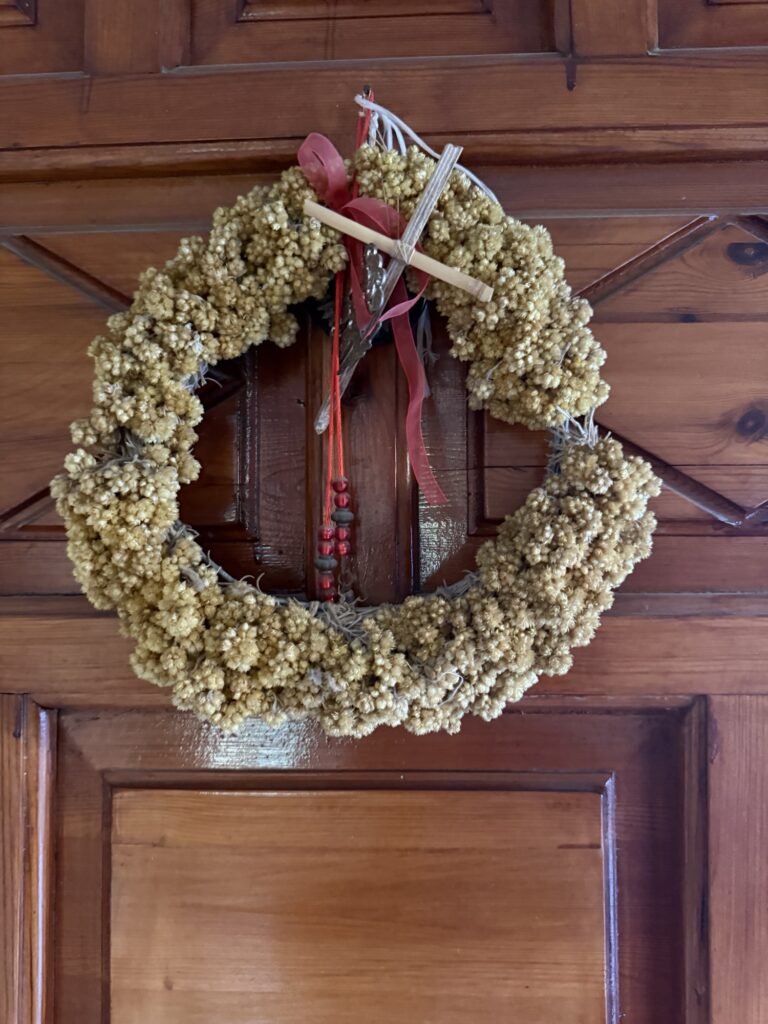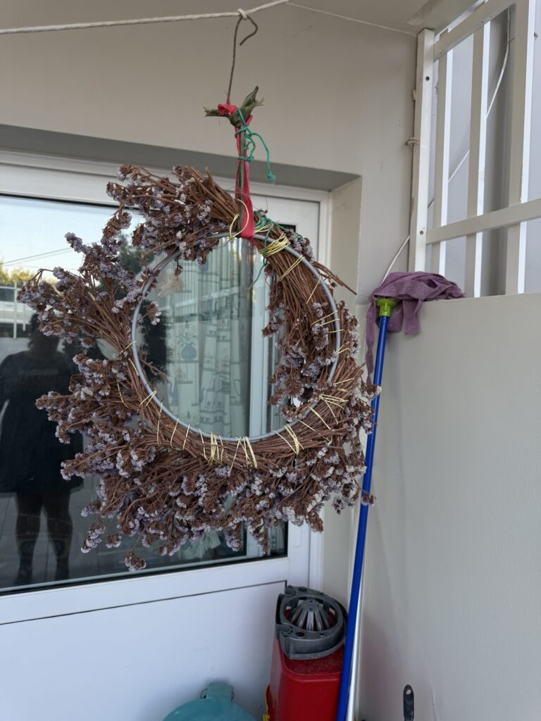 One of the clearest continuities is the use of floral wreaths. Ancient Greeks regularly made garlands for rituals, celebrations, and everyday life – a practice that closely resembles the Protomagia στεφάνι (wreath) still hung on doors today.